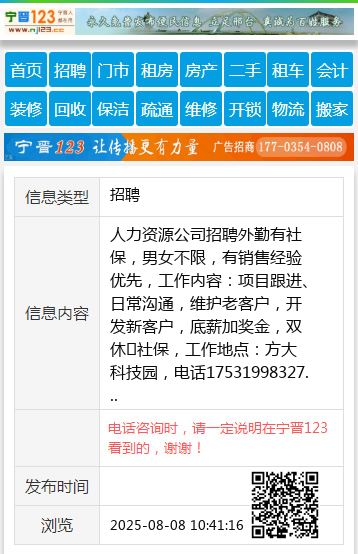 人力资源公司招聘外勤有社保,男女不限,有销售经验优先,工作内容:项目跟进、日常沟通,维护老客户,开发新客户,底薪加奖金,双休➕社保,工作地点:方大科技园,电话17531998327 【电话咨询时,请一定说明在宁晋123看到的,谢谢!】 |