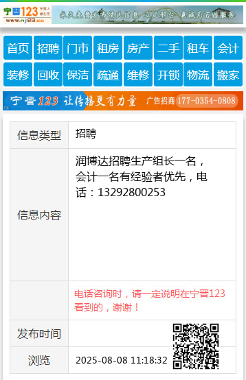 润博达招聘生产组长一名,会计一名有经验者优先,电话:13292800253