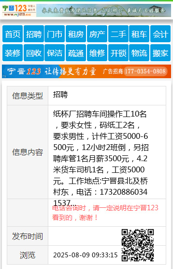 纸杯厂招聘车间操作工10名,要求女性,码纸工2名,要求男性,计件工资5000-6500元,12小时2班倒,另招聘库管1名月薪3500元,4.2米货车司机1名,工资5000元。工作地点:宁晋县北及桥村东,电话:17320886034 15373216896 【电话咨询时,请一定说明在宁晋123看到的,谢谢!】 |