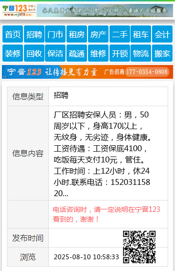 厂区招聘安保人员:男,50周岁以下,身高170以上,无纹身,无劣迹,身体健康。工资待遇:工资保底4100,吃饭每天支付10元,管住。工作时间:上12小时,休24小时.联系电话:15203115820 【电话咨询时,请一定说明在宁晋123看到的,谢谢!】 |