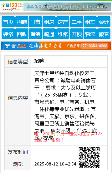 天津七星华控自动化仪表宁晋分公司.;诚聘电商销售若干.;要求:大专及以上学历‘(25-35周岁);专业:市场营销、电子商务、机电一体化等专业优先录取.;有淘宝、天猫、京东、拼多多、阿里巴巴线上销售经验优先录取.;男女不限.;待遇:底薪+提成试用期1-3个月.3000/月+提成.要求踏实肯干、有上进心.;每天工作八个小时.;五险.节假日全休.实行单双休;工作地点:方大科技园.;如有想法可以与我们联系.;联系电话:13752055332刘经理.;17867425860罗经理。 【电话咨询时,请一定说明在宁晋123看到的,谢谢!】 |