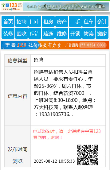 招聘电话销售人员和抖音直播人员,要求有责任心,年龄25-36岁,周六日休,节假日休,综合薪资7000+,上班时间8:30-18:00,地点:方大科技园,联系人赵经理:19331905736 【电话咨询时,请一定说明在宁晋123看到的,谢谢!】 |