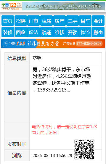 男,36岁踏实肯干,东市场附近居住,4.2米车辆经常熟练驾驶,找各种长期工作等,13933729113