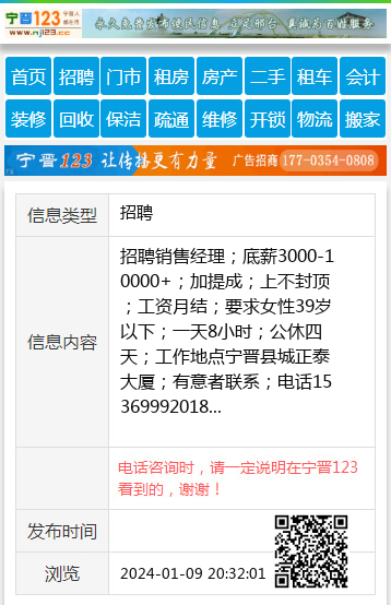 招聘销售经理;底薪3000-10000+;加提成;上不封顶;工资月结;要求女性39岁以下;一天8小时;公休四天;工作地点宁晋县城正泰大厦;有意者联系;电话15369992018 【电话咨询时,请一定说明在宁晋123看到的,谢谢!】 |