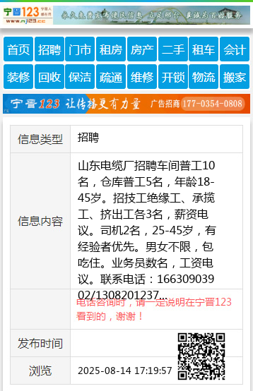 山东电缆厂招聘车间普工10名,仓库普工5名,年龄18-45岁。招技工绝缘工、承揽工、挤出工各3名,薪资电议。司机2名,25-45岁,有经验者优先。男女不限,包吃住。业务员数名,工资电议。联系电话:16630903902/13082012377 【电话咨询时,请一定说明在宁晋123看到的,谢谢!】 |