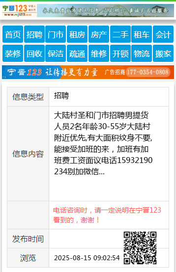 大陆村圣和门市招聘男提货人员2名年龄30-55岁大陆村附近优先,有大面积纹身不要,能接受加班的来,加班有加班费工资面议电话15932190234别加微信 【电话咨询时,请一定说明在宁晋123看到的,谢谢!】 |