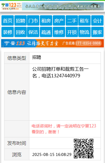 公司招聘打单和裁剪工各一名,电话13247440979
