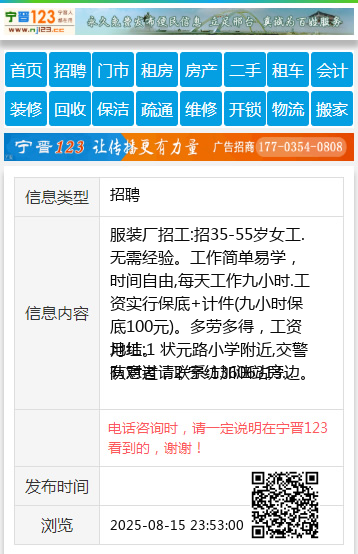 服装厂招工:招35-55岁女工.无需经验。工作简单易学,时间自由,每天工作九小时.工资实行保底+计件(九小时保底100元)。多劳多得,工资月结。