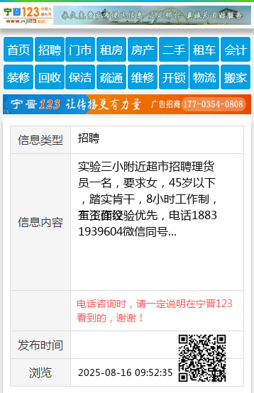 实验三小附近超市招聘理货员一名,要求女,45岁以下,踏实肯干,8小时工作制,工资面议,