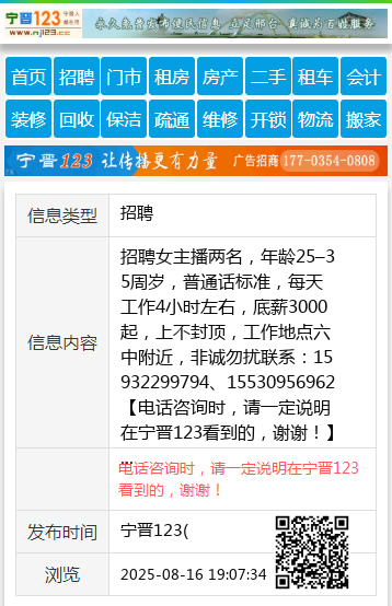 招聘女主播两名,年龄25–35周岁,普通话标准,每天工作4小时左右,底薪3000起,上不封顶,工作地点六中附近,非诚勿扰联系:15932299794、15530956962 【电话咨询时,请一定说明在宁晋123看到的,谢谢!】 |