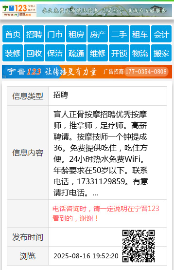 盲人正骨按摩招聘优秀按摩师,推拿师,足疗师。高薪聘请。按摩技师一个钟提成36。免费提供吃住,吃住方便。24小时热水免费WiFi。年龄要求在50岁以下。联系电话,17331129859。有意请打电话。 【电话咨询时,请一定说明在宁晋123看到的,谢谢!】 |