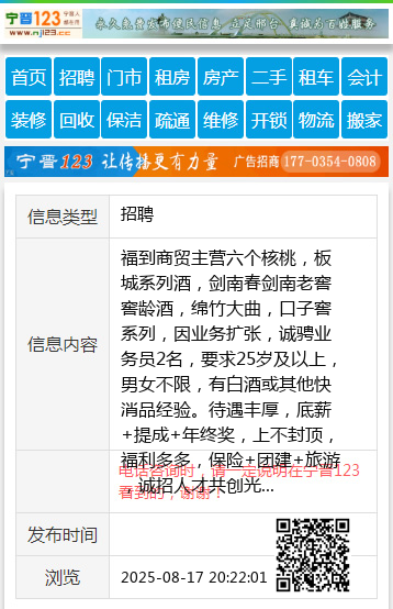 福到商贸主营六个核桃,板城系列酒,剑南春剑南老窖窖龄酒,绵竹大曲,口子窖系列,因业务扩张,诚骋业务员2名,要求25岁及以上,男女不限,有白酒或其他快消品经验。待遇丰厚,底薪+提成+年终奖,上不封顶,福利多多,保险+团建+旅游,诚招人才共创光辉!联系电话13323190399、18931931045 【电话咨询时,请一定说明在宁晋123看到的,谢谢!】 |