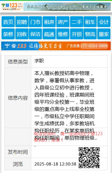 本人擅长教授初高中物理,数学,寒暑假从事家教,进入县级公立初中进行教授,四年班课经验,班课期间班级平均分全校第一,毕业班级的重点高中上线率全校第一,市级私立中学任职期间学生成绩优异,多家教培机构任职经历,在某家单招机构任职期间,单招物理班级平均分第一,刚考过的单招考试班级公办上线率80%,七名学生成绩600+;近期辅导复读生提分三百+,考入211。现接初高中数学物理学生辅导,联系电话15373776032 【电话咨询时,请一定说明在宁晋123看到的,谢谢!】 |