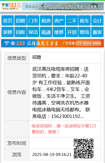 武汉高压电缆库房招聘:送货司机,要求:年龄22-40岁 有工作经验,能熟练开面包车,4米2货车,叉车,会做饭,生活干净卫生。 工资待遇高,空调洗衣机热水器电视冰箱电脑无线都有。 联系电话:15623001192 【电话咨询时,请一定说明在宁晋123看到的,谢谢!】 |