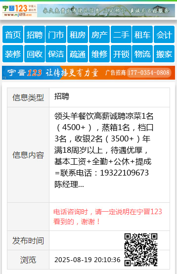 领头羊餐饮高薪诚聘凉菜1名(4500+),蒸箱1名,档口3名,收银2名(3500+)年满18周岁以上,待遇优厚,基本工资+全勤+公休+提成=联系电话:19322109673陈经理 【电话咨询时,请一定说明在宁晋123看到的,谢谢!】 |