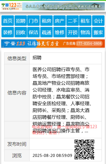 医养公司招聘行政专员、市场专员、市场经营部经理;晶龙地产物业公司招聘商旅公司经理、水电监审员、消防中控员;晶龙餐饮公司招聘安全质检经理、人事经理、厨师长、采购员;晶龙大酒店招聘餐厅经理、厨师长、烘焙运营经理;晶龙物流公司招聘进出口操作主管,岗位多多,有意者电话联系:03195856130 【电话咨询时,请一定说明在宁晋123看到的,谢谢!】 |