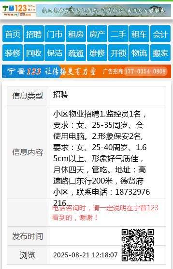 小区物业招聘1.监控员1名,要求:女、25-35周岁、会使用电脑。2.形象保安2名,要求:女、25-40周岁、1.65cm以上、形象好气质佳,月休四天,管吃。地址:高速路口东行200米,德贤府小区,联系电话:18732976216 【电话咨询时,请一定说明在宁晋123看到的,谢谢!】 |