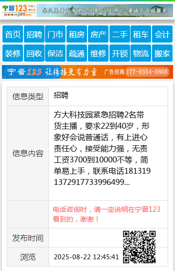 方大科技园紧急招聘2名带货主播,要求22到40岁,形象好会说普通话,有上进心责任心,接受能力强,无责工资3700到10000不等,简单易上手,联系电话1813191372917733996499 【电话咨询时,请一定说明在宁晋123看到的,谢谢!】 |
