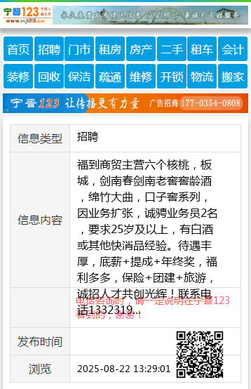 福到商贸主营六个核桃,板城,剑南春剑南老窖窖龄酒,绵竹大曲,口子窖系列,因业务扩张,诚骋业务员2名,要求25岁及以上,有白酒或其他快消品经验。待遇丰厚,底薪+提成+年终奖,福利多多,保险+团建+旅游,诚招人才共创光辉!联系电话13323190399、18931931045 【电话咨询时,请一定说明在宁晋123看到的,谢谢!】 |