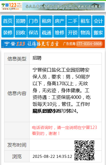 宁晋侯口盐化工业园招聘安保人员,要求:男,50周岁以下,身高170以上,无纹身,无劣迹,身体健康。工资待遇:工资保底4000,吃饭每天10元,管住。工作时间:上12小时,休24。