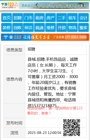 县城.招聘.手机饰品店,诚聘店员(女.长期)、每天工作7小时,大学生实习生、(可盖章)月工资2000-3000、年龄20周岁以上,有销售工作经验者优先,要求县城内居住、管饭。地址:宁晋县城信和商厦西邻、电话微信15373218875 【电话咨询时,请一定说明在宁晋123看到的,谢谢!】 |