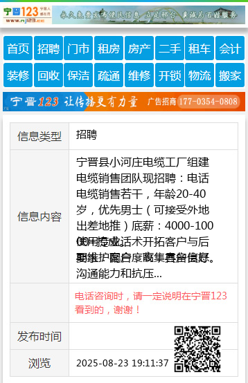 宁晋县小河庄电缆工厂组建电缆销售团队现招聘:电话电缆销售若干,年龄20-40岁,优先男士(可接受外地出差地推)底薪:4000-10000+提成。