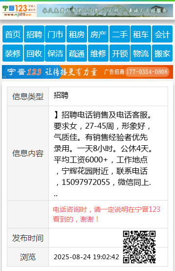 】招聘电话销售及电话客服。要求女,27-45周,形象好,气质佳。有销售经验者优先录用。一天8小时。公休4天。平均工资6000+,工作地点,宁辉花园附近,联系电话,15097972055,微信同上 【电话咨询时,请一定说明在宁晋123看到的,谢谢!】 |