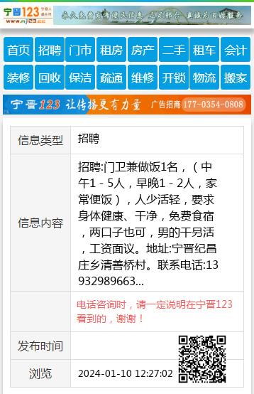 招聘:门卫兼做饭1名,(中午1-5人,早晚1-2人,家常便饭),人少活轻,要求身体健康、干净,免费食宿,两口子也可,男的干另活,工资面议。地址:宁晋纪昌庄乡清善桥村。联系电话:13932989663 【电话咨询时,请一定说明在宁晋123看到的,谢谢!】 |