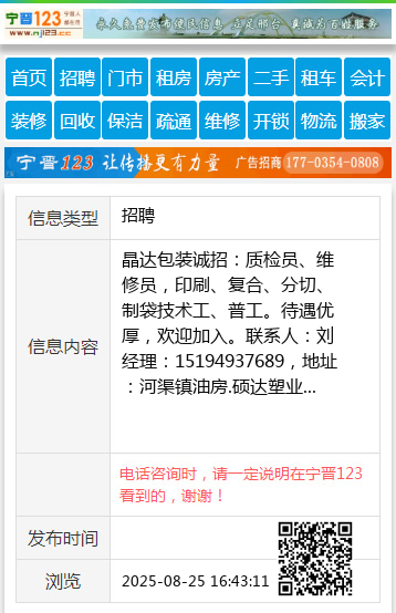 晶达包装诚招:质检员、维修员,印刷、复合、分切、制袋技术工、普工。待遇优厚,欢迎加入。联系人:刘经理:15194937689,地址:河渠镇油房.硕达塑业 【电话咨询时,请一定说明在宁晋123看到的,谢谢!】 |
