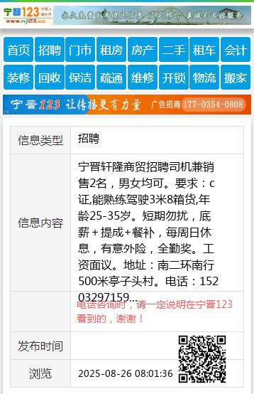 宁晋轩隆商贸招聘司机兼销售2名,男女均可。要求:c证,能熟练驾驶3米8箱货,年龄25-35岁。短期勿扰,底薪+提成+餐补,每周日休息,有意外险,全勤奖。工资面议。地址:南二环南行500米亭子头村。电话:15203297159 【电话咨询时,请一定说明在宁晋123看到的,谢谢!】 |
