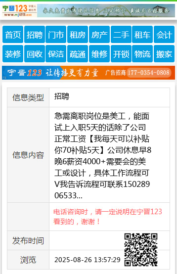 急需离职岗位是美工,能面试上入职5天的话除了公司正常工资【我每天可以补贴你70补贴5天】公司休息早8晚6薪资4000+需要会的美工或设计,具体工作流程可V我告诉流程可联系15028906533 【电话咨询时,请一定说明在宁晋123看到的,谢谢!】 |
