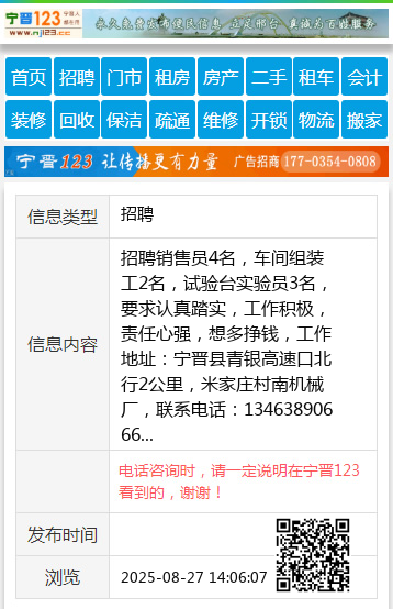 招聘销售员4名,车间组装工2名,试验台实验员3名,要求认真踏实,工作积极,责任心强,想多挣钱,工作地址:宁晋县青银高速口北行2公里,米家庄村南机械厂,联系电话:13463890666 【电话咨询时,请一定说明在宁晋123看到的,谢谢!】 |