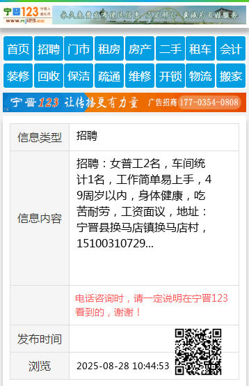 招聘:女普工2名,车间统计1名,工作简单易上手,49周岁以内,身体健康,吃苦耐劳,工资面议,地址:宁晋县换马店镇换马店村,15100310729 【电话咨询时,请一定说明在宁晋123看到的,谢谢!】 |