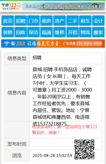 县城.招聘.手机饰品店,诚聘店员(女.长期)、每天工作7小时,大学生实习生、(可盖章)月工资2000-3000、年龄20周岁以上,有销售工作经验者优先,要求县城内居住、管饭。地址:宁晋县城信和商厦西邻、电话微信15373218875 【电话咨询时,请一定说明在宁晋123看到的,谢谢!】 |