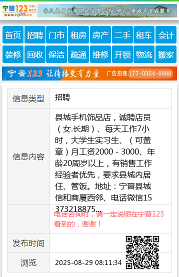 县城手机饰品店,诚聘店员(女.长期)、每天工作7小时,大学生实习生、(可盖章)月工资2000-3000、年龄20周岁以上,有销售工作经验者优先,要求县城内居住、管饭。地址:宁晋县城信和商厦西邻、电话微信15373218875 【电话咨询时,请一定说明在宁晋123看到的,谢谢!】 |