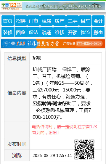机械厂招聘:二保焊工、喷涂工、普工、机械绘图师、(1名)(年龄25——50周岁,工资:7000元--15000元,要求,有责任心,沟通力强,工作时间9小时。
