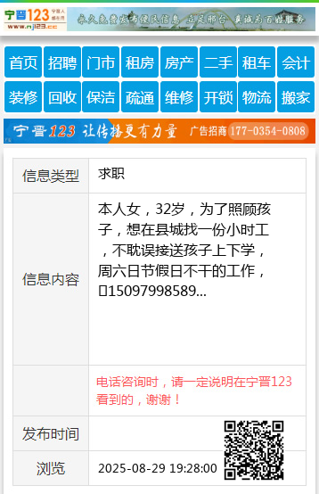 本人女,32岁,为了照顾孩子,想在县城找一份小时工,不耽误接送孩子上下学,周六日节假日不干的工作,15097998589 【电话咨询时,请一定说明在宁晋123看到的,谢谢!】 |