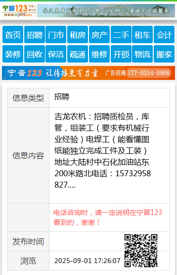 吉龙农机:招聘质检员,库管,组装工(要求有机械行业经验)电焊工(能看懂图纸能独立完成工件及工装)地址大陆村中石化加油站东200米路北电话:15732958827. 【电话咨询时,请一定说明在宁晋123看到的,谢谢!】 |