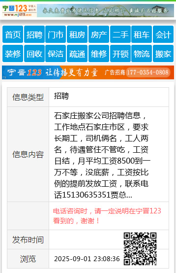 石家庄搬家公司招聘信息,工作地点石家庄市区,要求长期工,司机俩名,工人两名,待遇管住不管吃,工资日结,月平均工资8500到一万不等,没底薪,工资按比例的提前发放工资,联系电话15130635351贾总 【电话咨询时,请一定说明在宁晋123看到的,谢谢!】 |