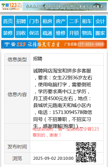 诚聘网店淘宝和拼多多客服,要求:女生22到36岁左右,使用电脑打字,需要倒班,学历要求高中以上学历,月工资4500元左右,地点:县城状元路南天和城小区内,电话:15713094578微信同号(不招兼职,不招实习生,感谢理解[抱拳]) 【电话咨询时,请一定说明在宁晋123看到的,谢谢!】 |