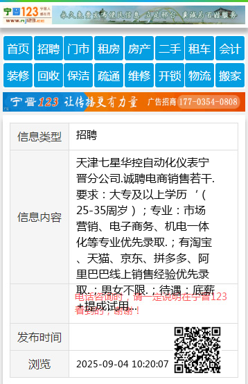 天津七星华控自动化仪表宁晋分公司.诚聘电商销售若干.要求:大专及以上学历‘(25-35周岁);专业:市场营销、电子商务、机电一体化等专业优先录取.;有淘宝、天猫、京东、拼多多、阿里巴巴线上销售经验优先录取.;男女不限.;待遇:底薪+提成试用期1-3个月.3000/月+提成.要求踏实肯干、有上进心..每天工作八个小时.;五险.节假日全休.实行单双休,工作地点:方大科技园.如有想法可以与我们联系..联系电话:13752055332刘经理.17867425860罗经理 【电话咨询时,请一定说明在宁晋123看到的,谢谢!】 |