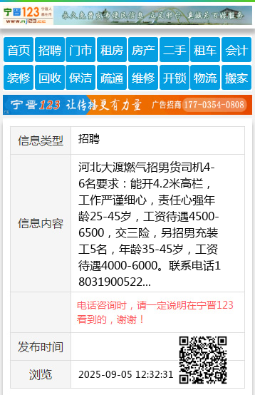 河北大渡燃气招男货司机4-6名要求:能开4.2米高栏,工作严谨细心,责任心强年龄25-45岁,工资待遇4500-6500,交三险,另招男充装工5名,年龄35-45岁,工资待遇4000-6000。联系电话18031900522 【电话咨询时,请一定说明在宁晋123看到的,谢谢!】 |