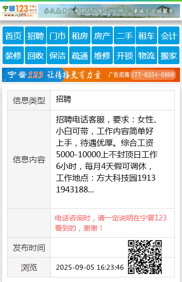 招聘电话客服,要求:女性、小白可带,工作内容简单好上手,待遇优厚。综合工资5000-10000上不封顶日工作6小时,每月4天假可调休,工作地点:方大科技园19131943188 【电话咨询时,请一定说明在宁晋123看到的,谢谢!】 |