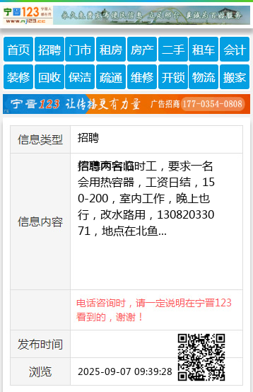 招聘两名临时工,要求一名会用热容器,工资日结,150-200,室内工作,晚上也行,改水路用,13082033071,地点在北鱼 【电话咨询时,请一定说明在宁晋123看到的,谢谢!】 |