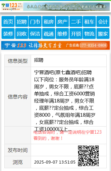 宁晋酒吧(原七鑫酒吧)招聘以下岗位: 服务员年龄满18周岁,男女不限,底薪??点单抽成,综合工资6000 营销经理年满18周岁,男女不限,底薪??定台抽成,综合工资8000, 气氛组年满18周岁,女底薪??定台抽成,综合工资10000 以上岗位具体待遇面谈 联系电话17305167717