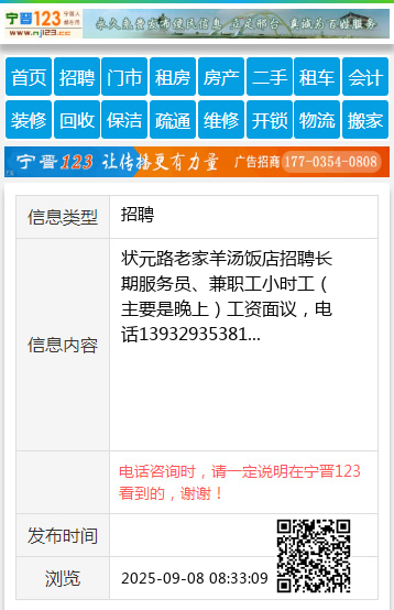 状元路老家羊汤饭店招聘长期服务员、兼职工小时工(主要是晚上)工资面议,电话13932935381
