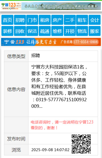 宁晋方大科技园招保洁1名,要求:女,55周岁以下,公休多、工作轻松、身体健康和有工作经验者优先,在县城附近居住优先,联系电话:0319-577776715100932009 【电话咨询时,请一定说明在宁晋123看到的,谢谢!】 |