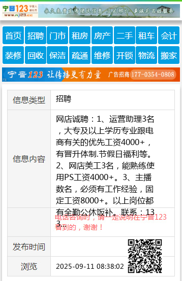 网店诚聘:1、运营助理3名,大专及以上学历专业跟电商有关的优先工资4000+,有晋升体制.节假日福利等。2、网店美工3名,能熟练使用PS工资4000+。3、主播数名,必须有工作经验,固定工资8000+。以上岗位都有全勤公休饭补。联系:13303194319 宁高路电视台西行 【电话咨询时,请一定说明在宁晋123看到的,谢谢!】 |
