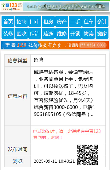 诚聘电话客服,会说普通话,业务简单易上手,免费培训,可以接送孩子,男女均可,短期勿扰,18-45岁,有客服经验优先,月休4天〉综合薪资3000-6000,电话19061895105(微信同号)