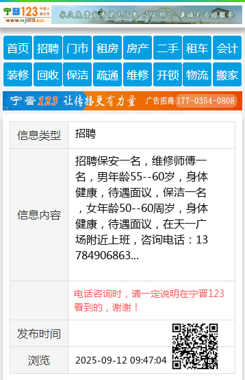 招聘保安一名,维修师傅一名,男年龄55--60岁,身体健康,待遇面议,保洁一名,女年龄50--60周岁,身体健康,待遇面议,在天一广场附近上班,咨询电话:13784906863 【电话咨询时,请一定说明在宁晋123看到的,谢谢!】 |
